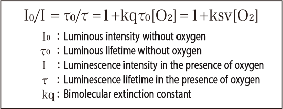 The relationship between the intensity and lifetime of luminescence in the absence of oxygen and the intensity and lifetime of luminescence in the presence of oxygen is expressed by the Stern-Former equation.